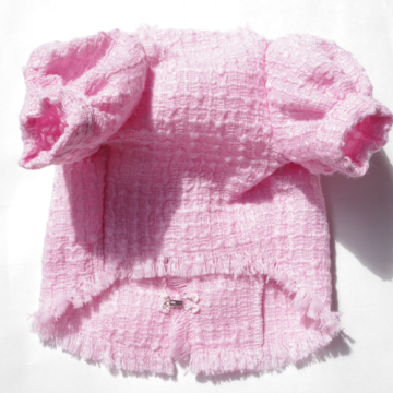 CHANEL使用の鮮やかなイタリア製最高級ツイード。人間と同じ仕様のLuxuryなジャケットに仕立てました。ツイードならではのフリンジにデニムがとってもお洒落。パフスリーブでガーリーに。お揃いワンピとアンサンブルで。